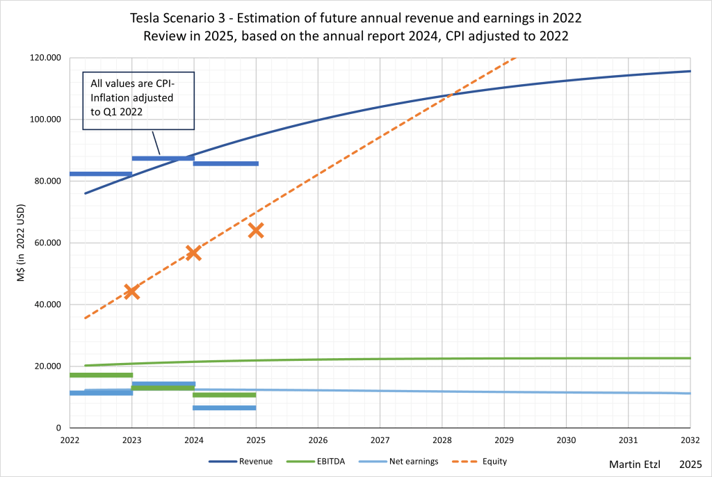 Here is a comparison of the reported numbers until end of 2024 with the scenario 3 forecast from Q1 2022.