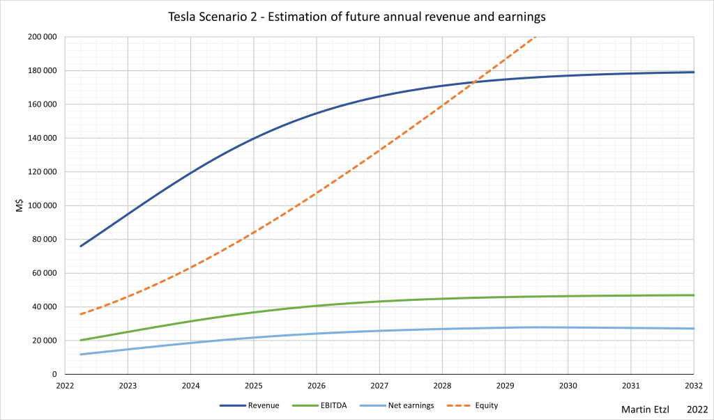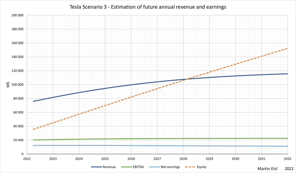 I could have argued the following without using models: I think Tesla will reach annual sales of 120B$ with a net profit margin of 10% which should be honored by the market with an evaluation of 200B$. This would have saved me a lot of time, however with the scenarios and the graphs as a visual aid, it is easier to imagine the future development. Furthermore, with the model I was forced to do a lot of research, which I might not have done without the model.