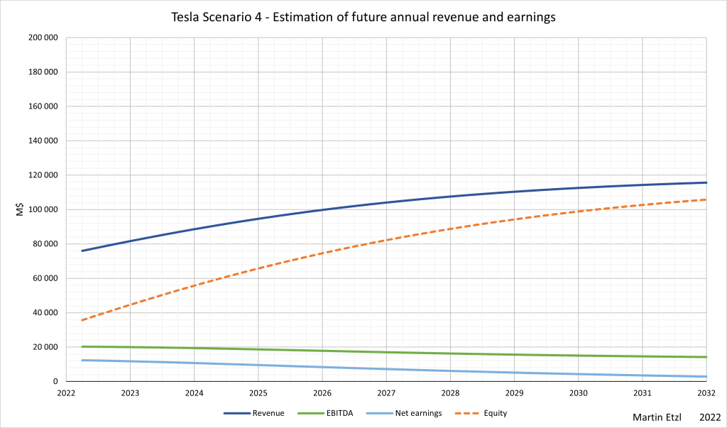 We can see, that even the brightes scenario of all gives us just a little return. The high evaluation of Tesla makes it very unattractive to invest. Tesla was a ten-bagger in the past, but will never be another ten-bagger at today’s evaluation of an incredibly high one trillion $. A ten-bagger in the other direction would be much more probable, leaving many sanguine investors in desperation.