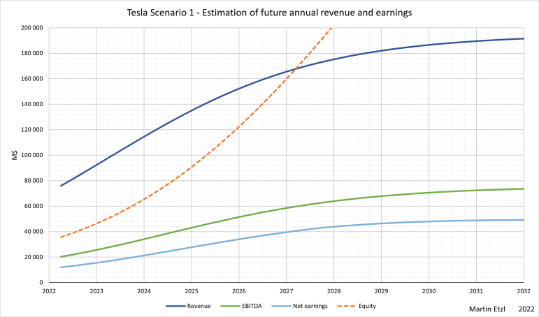 I could have argued the following without using models: I think Tesla will reach annual sales of 120B$ with a net profit margin of 10% which should be honored by the market with an evaluation of 200B$. This would have saved me a lot of time, however with the scenarios and the graphs as a visual aid, it is easier to imagine the future development. Furthermore, with the model I was forced to do a lot of research, which I might not have done without the model.