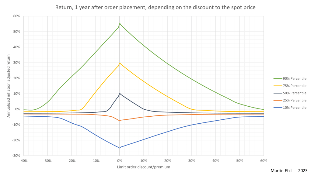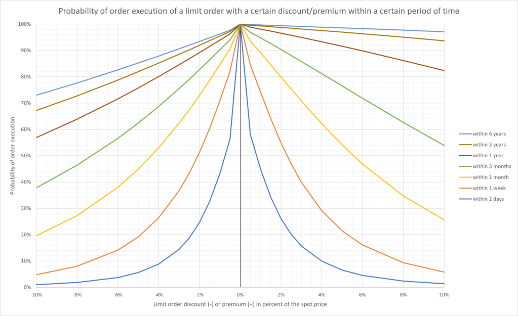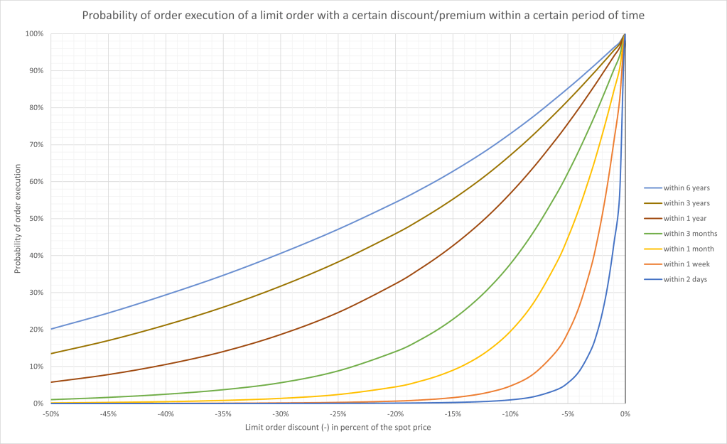 It is not surprising that the probability declines with an increase in the discount or premium. For example, there is only a 20% chance of a order execution within 1 month after placing a limit order with 10% discount. Please remember that this is the average probability within the analyzed period and the probabilities are varying from time to time.