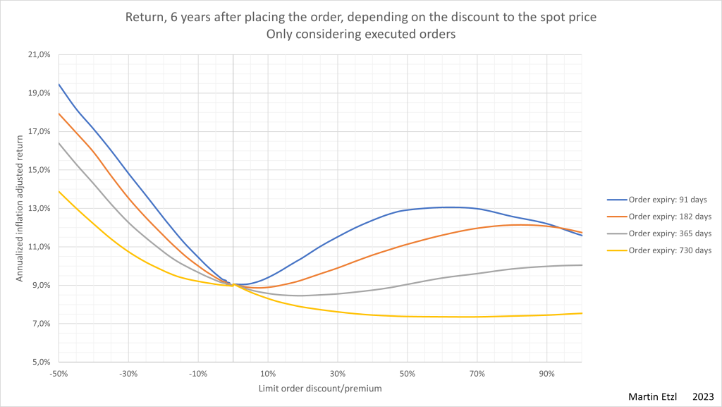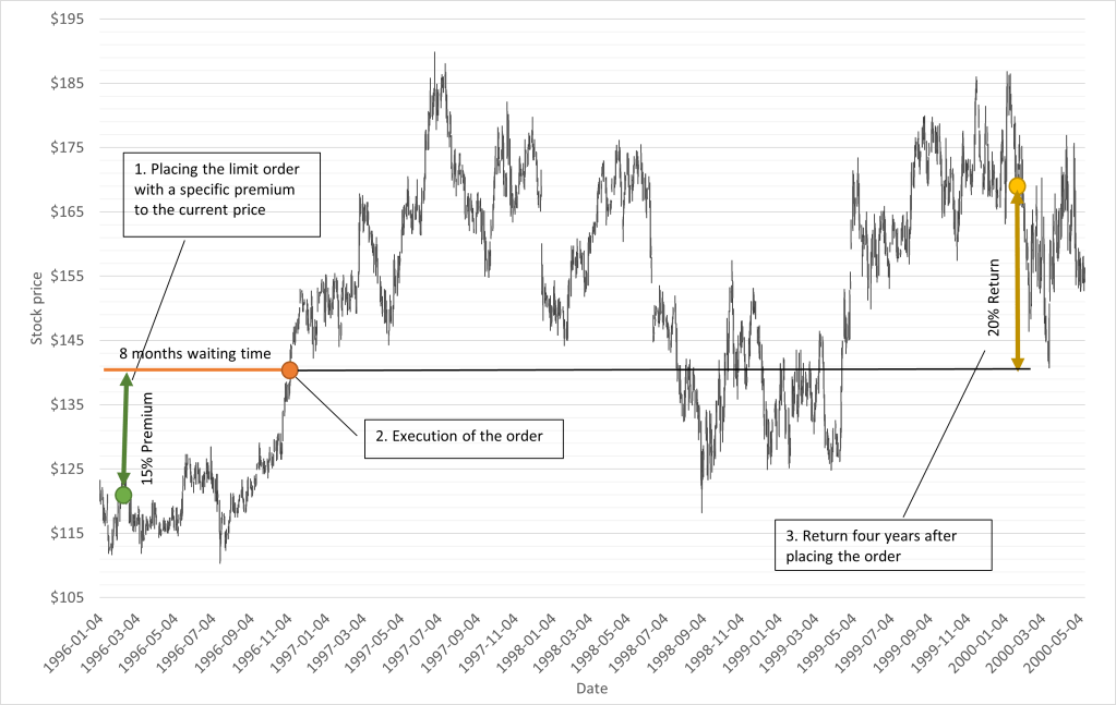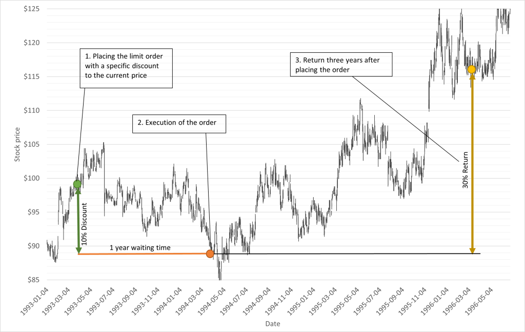 The next step is to investigate, how limit orders would have behaved. So, a limit order is placed (Graph 2: green point) with a certain discount. Then it takes a while, until the price reaches the limit and the order will be executed (orange point) (there is also the possibility, that the limit will never be reached). After possessing the share, the next interesting information is, how the return will be, let’s say in three year. (yellow point).