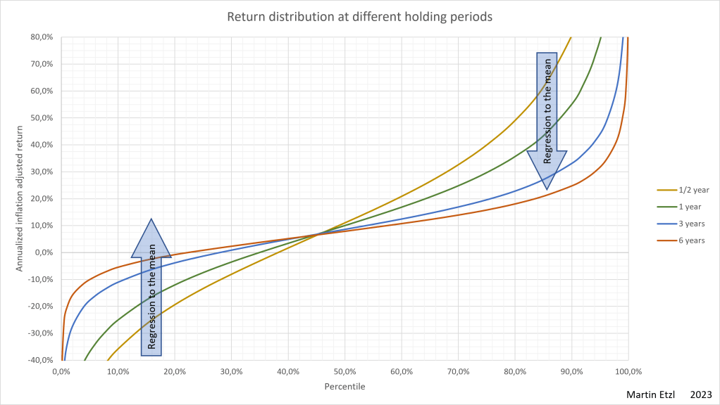 When looking at graph 1 at the 1 year holding period (orange line), we can see that the bottom 10% of the analyzed dataset have an annual return of less than -25% ant the top 10% (=90% percentile) have an annual return of more than 55%. At longer holding periods, the extreme values “normalize” and go towards the mean. This effect is called “regression to the mean” or “mean reversion” and can be senn clearly in this graph 1.