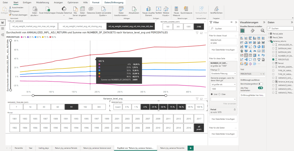 There is another attribute, that has an influence on the result. The trailing period is the period between the current date and a past date, which is used for calculating the volatility. In graph 9, it is clearly visible, that the volatility of the last week has very little to say about the return for the next 6 years. The effect on returns is already visible at the trailing month and gets stronger, the longer the trailing period is. 1 year is the longest period, I analysed.