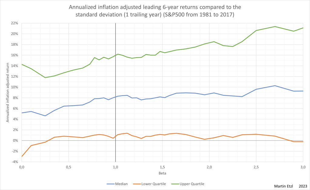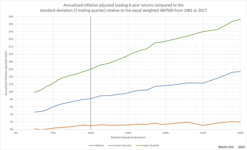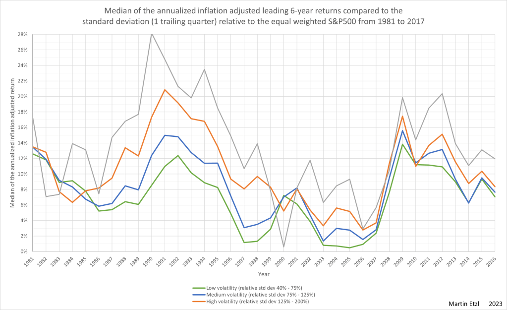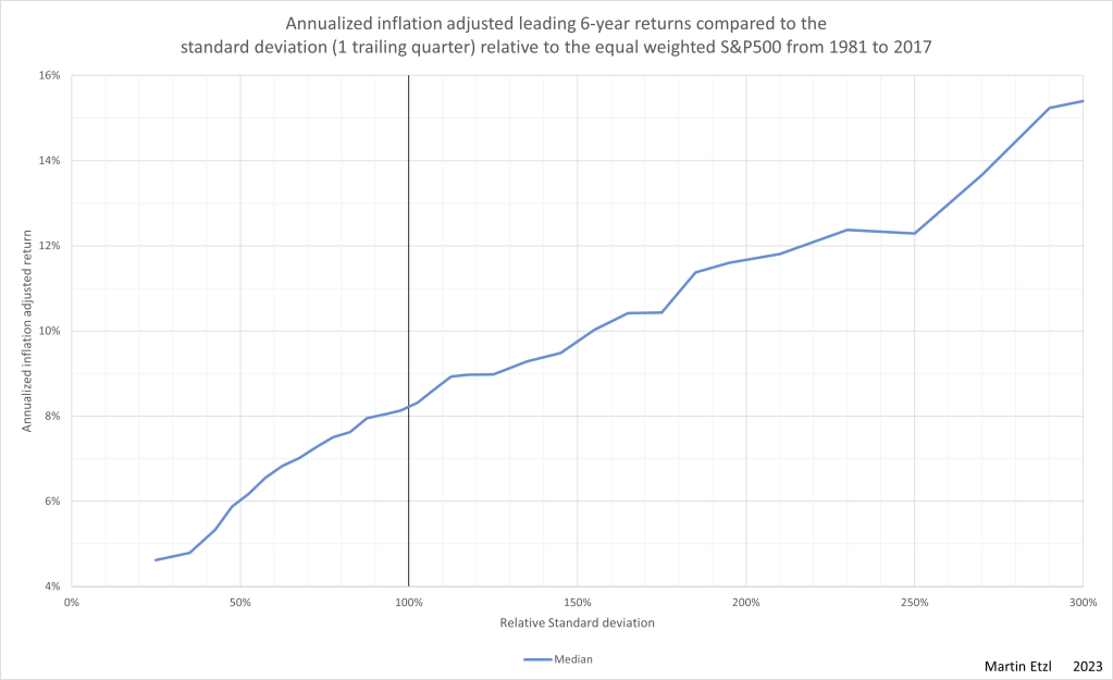 In graph 4, the median-annualized-inflation-adjusted 6-years-leading-return can be seen on the y-axis in relation to the 1-quarter-trailing relative standard deviation.