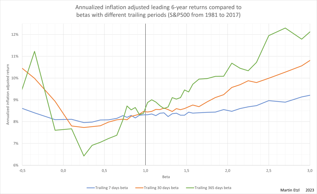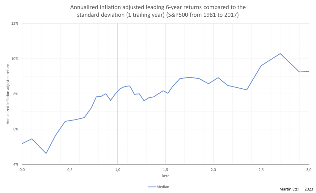 Let’s have a look at the result, based on the widely used beta. In the following graphs, there can be seen the annualized inflation adjusted leading 6-year return, compared to the beta (1 trailing year)