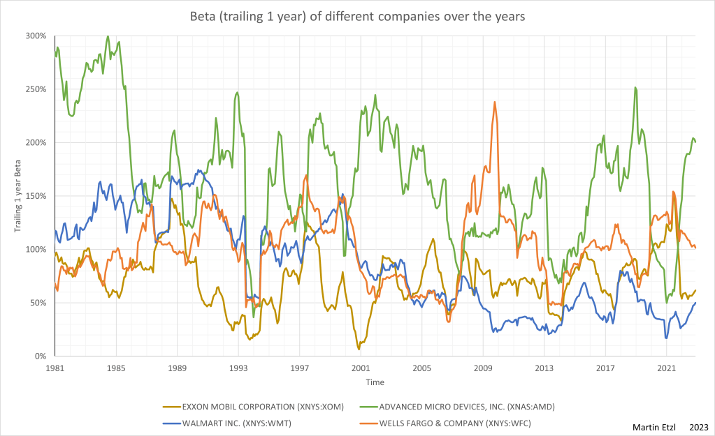 There is another question that arise. Does one company always have a similar volatility, or does the volatility change significantly over time. In graph 8, there are 4 examples and it can be seen, that the beta is highly fluctuating. For example, Wells Fargo changed from a beta of 0.4 (which should be a very save investment, according to theory) to a beta of 2.4 (a very risky business) within a short period of time.